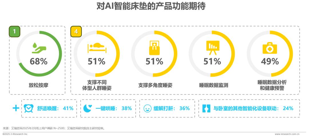 二是智能赋能。智能技术已从噱头转变为睡眠管理的核心。艾瑞咨询数据显示,AI 智能床垫将成为中国睡眠消费的新热点,68%的消费者希望通过 AI 智能床垫进行深度放松按摩,帮助入睡。比如慕思的 AI 智能床垫,能够主动贴合人体曲线,保持稳定的柔软度和支撑力,推动了消费者对睡眠质量的量化监测和管理。