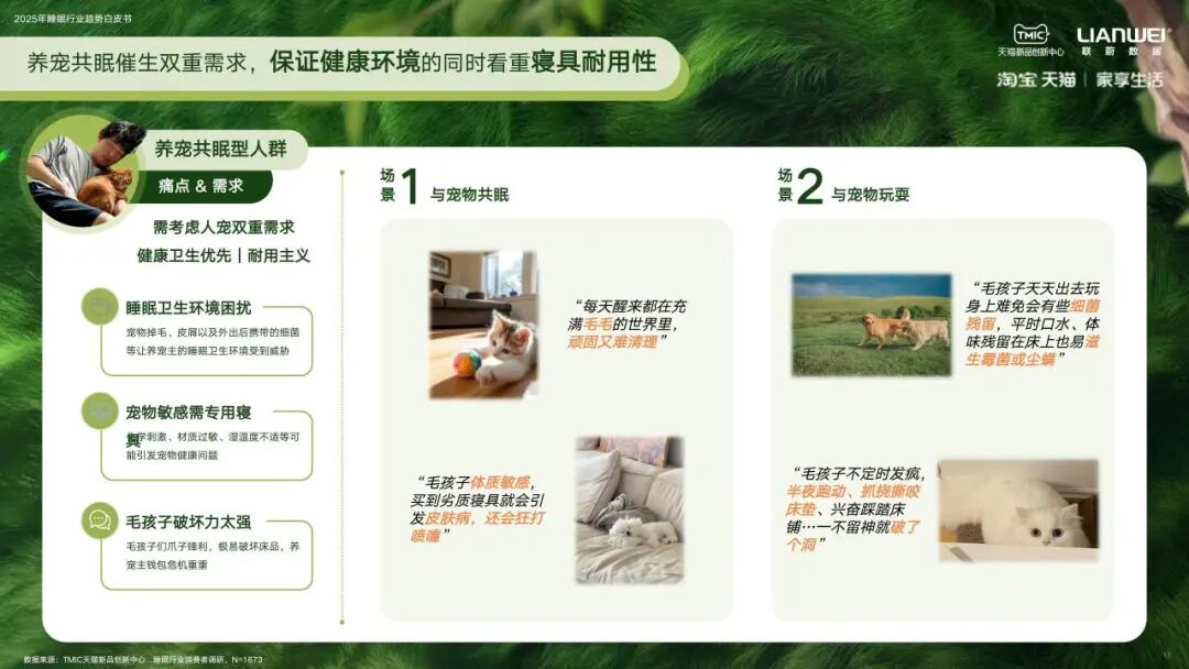 养宠共眠型人群是与猫毛尿渍战斗的「卫生指挥官」。TMIC 数据显示,宠物共眠场景下的核心问题是保证健康的睡眠环境和寝具的耐用性。因此,他们会优先选择具备抑菌卫生、防水防污易清洗、耐撕咬这三重特性的家纺产品,以在不影响人宠亲密互动的前提下,营造健康可持续的睡眠卫生环境。