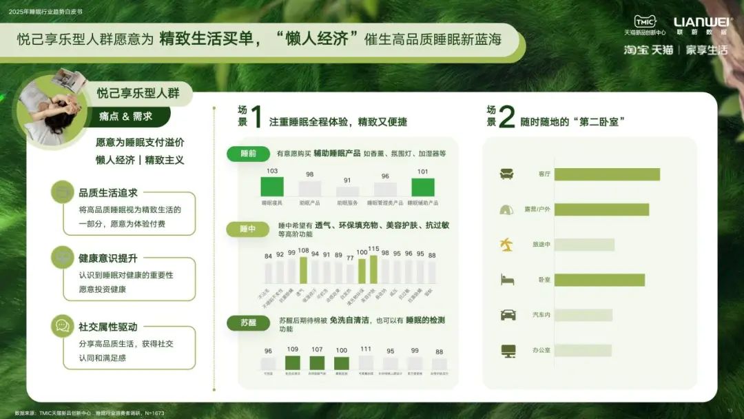 悦己享乐型人群堪称「生活的策展人」。《白皮书》显示,这一群体愿意为高品质生活买单,“懒人经济”的背后是对品质的追求。他们的睡前仪式丰富而精致,点燃香薰蜡烛,在暖光中铺开具有美容护肤功能的天丝被,盖上真丝眼罩,仿佛置身于一个只属于自己的静谧世界。他们用高颜值的寝具打造出微型艺术馆,让入睡成为一场每日的感官盛宴。