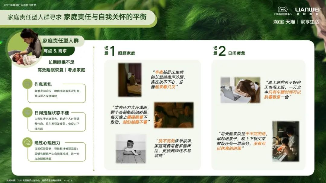 家庭责任型的已婚已育人群是平衡育儿养老的「生活平衡家」。深夜孩子吐奶弄脏床单,老人咳嗽声不断,家务压力和健康担忧让他们的睡眠空间不断被压缩。他们需要的产品既能满足家庭照料的需求,如便捷易收纳的可拆洗拼接床品、抗皱耐用的环保材质,又能保障自身的睡眠质量,如透气抗菌静音的产品。
