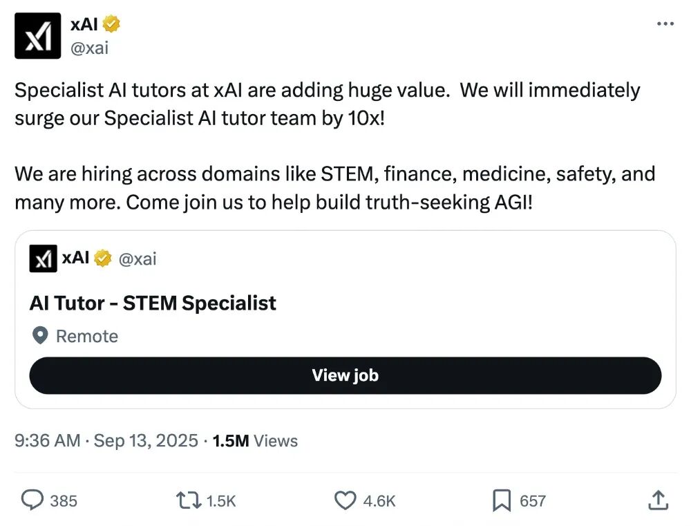 周六,xAI发布推文,称“xAI专业AI导师正创造巨大价值。我们将立即将专业AI导师团队规模扩大十倍!现正招聘STEM(科学、技术、工程、数学)、金融、医学、安全等众多领域人才。加入我们,共同构建追求真理的AGI!”