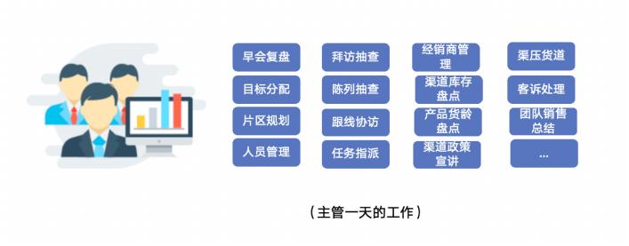从这些特征可知,快消行业需投入大量销售人员,且他们每天要做大量重复性工作。为量化销售人员工作,以下图为例,分别列出销售员和销售主管一天的典型工作事项。
