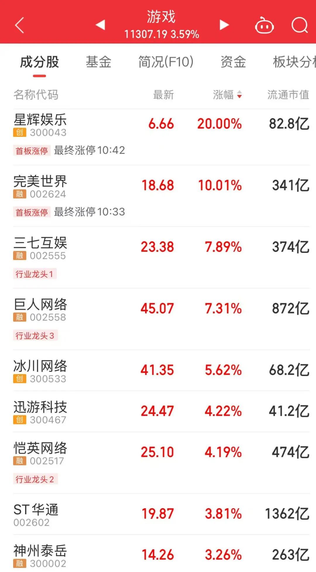 今日上午,游戏板块大幅上涨,星辉娱乐、完美世界等个股涨幅居前。
