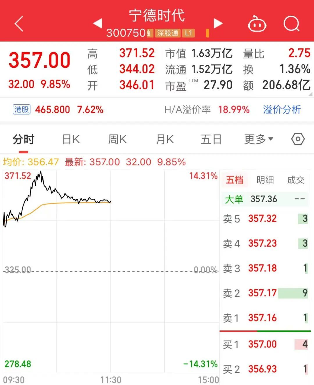 对指数贡献最大的当属新能源两大龙头股宁德时代和阳光电源。宁德时代上午涨幅达9.85%,盘中一度涨超14%,创下历史新高,成交额为206.68亿元,位居A股首位。阳光电源上午涨幅超5%,盘中股价也刷新了历史新高。