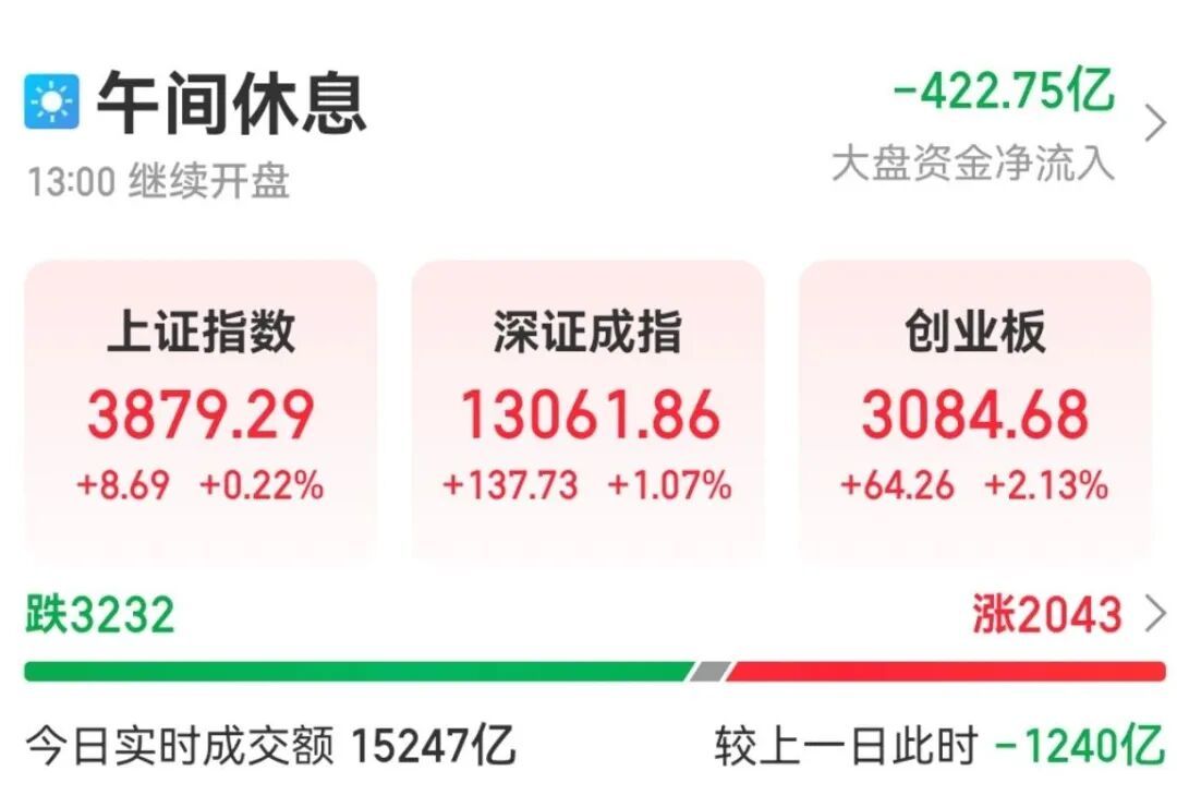 截至上午收盘,上证指数上涨0.22%,深证成指上涨1.07%,创业板指上涨2.13%。