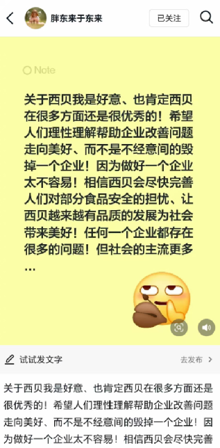 9月13日,于东来再次发文:“每个企业都会发生管理上的漏洞和经营上的问题,西贝如果有存在的问题,相信一定会积极调整处理解决、一定会越来越重视提升商品品质和顾客满意。相信西贝和更多企业会越来越好!”
