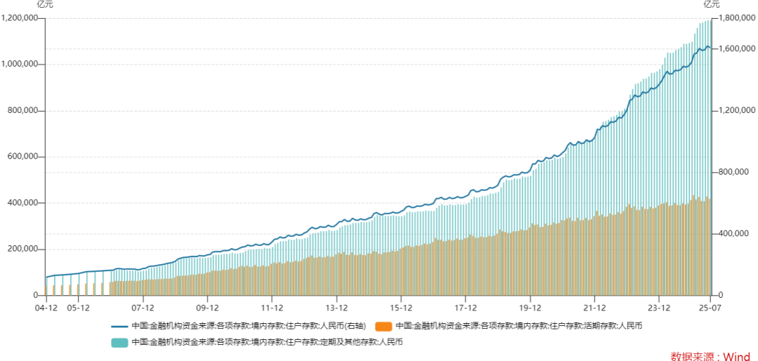 在住户存款中,活期存款与定期存款的比例大约是1:3,即当前160万亿的住户存款中,活期存款约40万亿元,定期与其他存款约120万亿元。