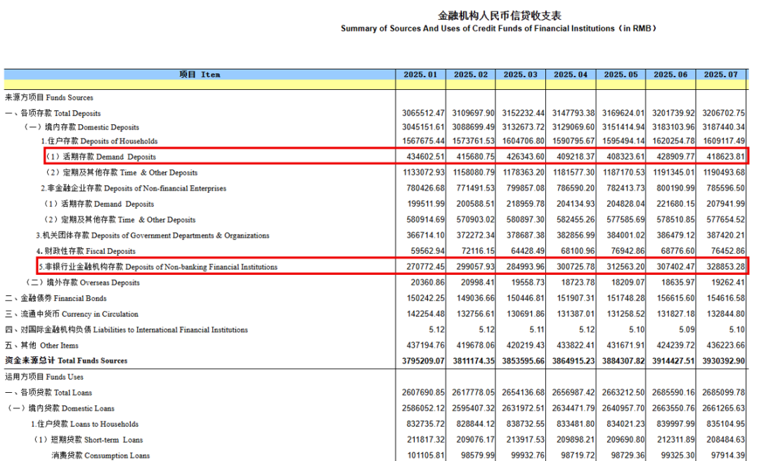 对比8月13日公布的7月份存款数据:7月末,人民币存款余额320.67万亿元,同比增长8.7%。前七个月人民币存款增加18.44万亿元。其中,住户存款增加9.66万亿元,非金融企业存款增加3109亿元,财政性存款增加2.02万亿元,非银行业金融机构存款增加4.69万亿元。
