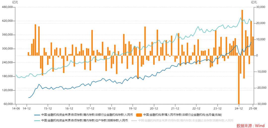 简单总结7 - 8月情况,居民部门存款不仅没怎么增加,反而减少了1万亿,而非银行业金融机构的存款暴增了3.32万亿元。过去几年,中国广义货币(M2)大致以每年8 - 9%的速度增加,剔除季节性影响,住户存款理应每月增长,但从2025年1月至今,居民部门存款不增反减,这很反常。而此时非银行业金融机构存款反常增加,自然得出存款搬家的逻辑。