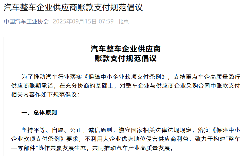 17家车企“60天账期承诺”集体行动宣言发布3个月后,整车企业与供应商企业之间的账期承诺行动仍在持续。9月15日,中国汽车工业协会发布《汽车整车企业供应商账款支付规范倡议》(以下简称《倡议》)。