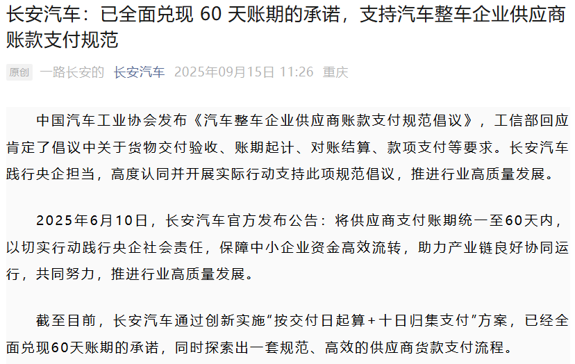 上汽集团宣布将供应商支付账期统一至60天内,不采用增加供应商资金压力的结算方式。长安汽车表示已通过创新方案全面兑现60天账期承诺。