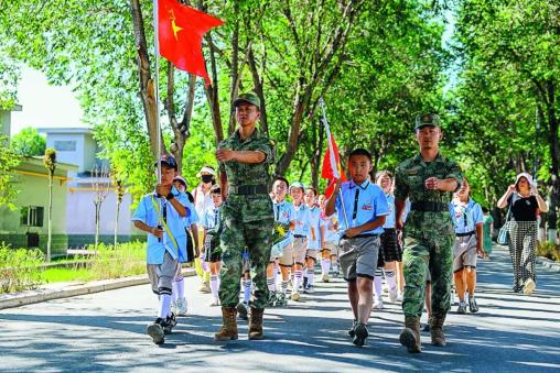 近日,新疆军区某团举办军营开放日活动,邀请驻地小学学生走进军营,参观内务设置、接受红色教育,增强国防观念。