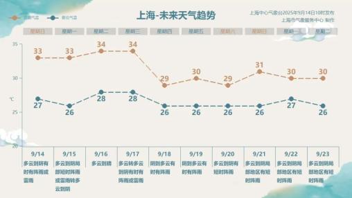 今日雨水减弱,天气为多云到阴,局部有短时阵雨或雷雨,气温在26~33℃。周二起副热带高压将加强,申城以多云天气为主,最高气温将升至34℃左右。周三后期至周四受冷暖空气共同影响,申城将有一次较明显的降水过程,届时最高气温将回落至29℃。