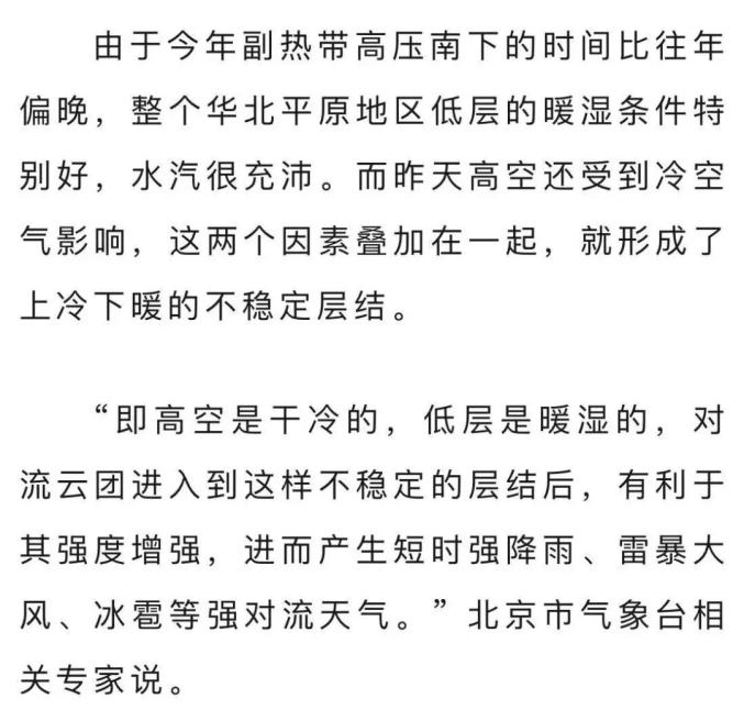 北京市气象台相关专家表示:“对流云团在自西向东移动时,经过丰台、大兴、朝阳南部和通州,移动路径大概是一条40多公里长,2至3公里宽的窄带。冰雹就产生于这条窄带。”