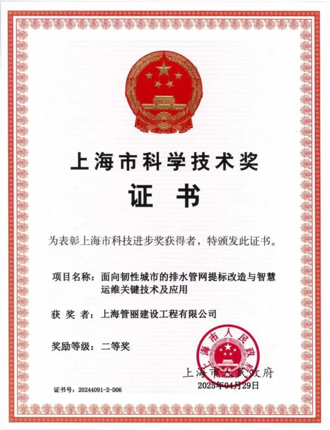 日前,2024年度上海市科学技术奖公布,由同济大学、上海市排水管理事务中心和管丽建设联合完成的“面向韧性城市的排水管网提标改造与智慧运维关键技术及应用”项目荣获上海市科技进步奖二等奖。