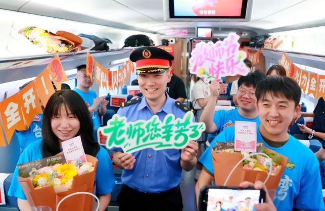 当天恰逢教师节,值乘此次列车的合肥客运段为助威粉丝团中的教师们送上了节日礼物和鲜花,让球迷车厢更添温暖。
