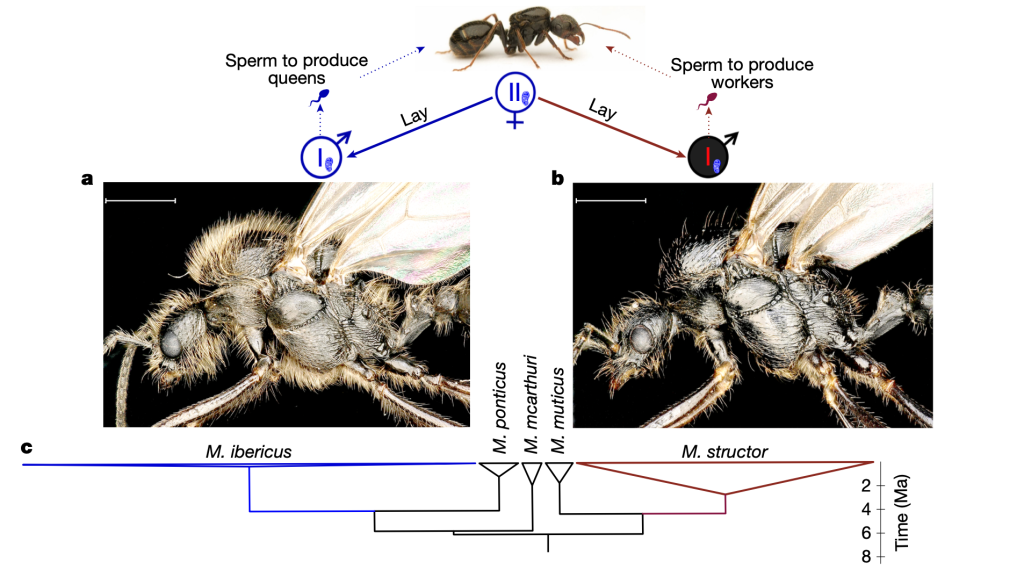研究人员推断,这个演化故事始于一种名为“精子寄生”(sperm parasitism)的现象。数百万年前,伊比利亚收获蚁的蚁后因未知原因失去了生产本物种工蚁的能力。为了维持蚁群的运作,它们不得不“借用”生活在附近的工匠收获蚁雄蚁的精子,与自己的卵结合,生产出兼具两个物种基因的混血工蚁。这些混血工蚁构成了蚁群的主要劳动力。