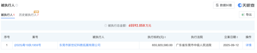 除了上述纠纷外,新世纪公司还有一单执行案件。9月12日,天眼查信息显示,新世纪公司被广东省东莞市中级人民法院立案执行,案号为(2025)粤19执1959号,执行标的金额高达6.56亿元。