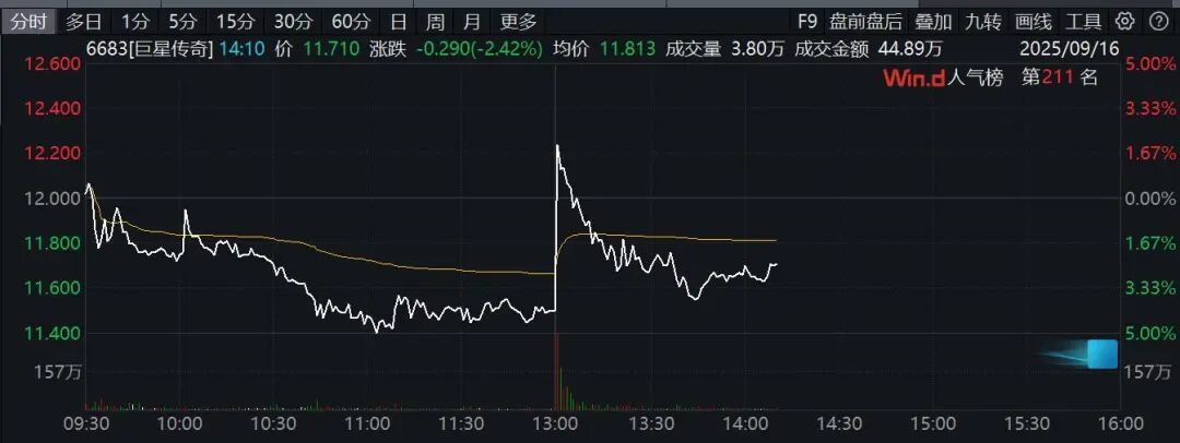公告发布后,巨星传奇股价从下跌4%左右,垂直拉升至上涨1%。截至记者发稿,股价回归震荡行情。