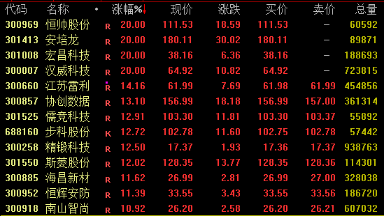 场内超3600只股票飘红。物流板块崛起,新宁物流、炬申股份、怡亚通等涨停;汽车产业链股活跃,恒帅股份、均胜电子等涨停,豪恩汽电盘中突破200元/股大关,续创新高;机器人概念再度爆发,安培龙尾盘涨停,续创新高,汉威科技亦创出新高。值得注意的是,首开股份再度涨停,近10日斩获9个涨停板;上海建工连续3日涨停。