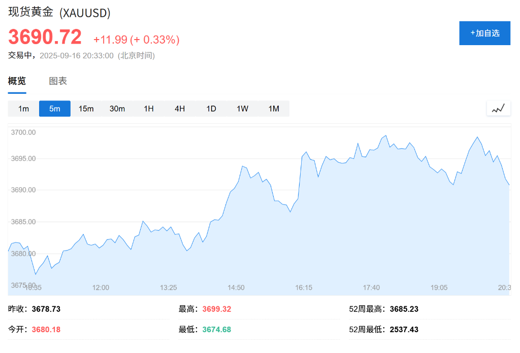 数据公布后,现货黄金小幅回落,现报3690美元/盎司。