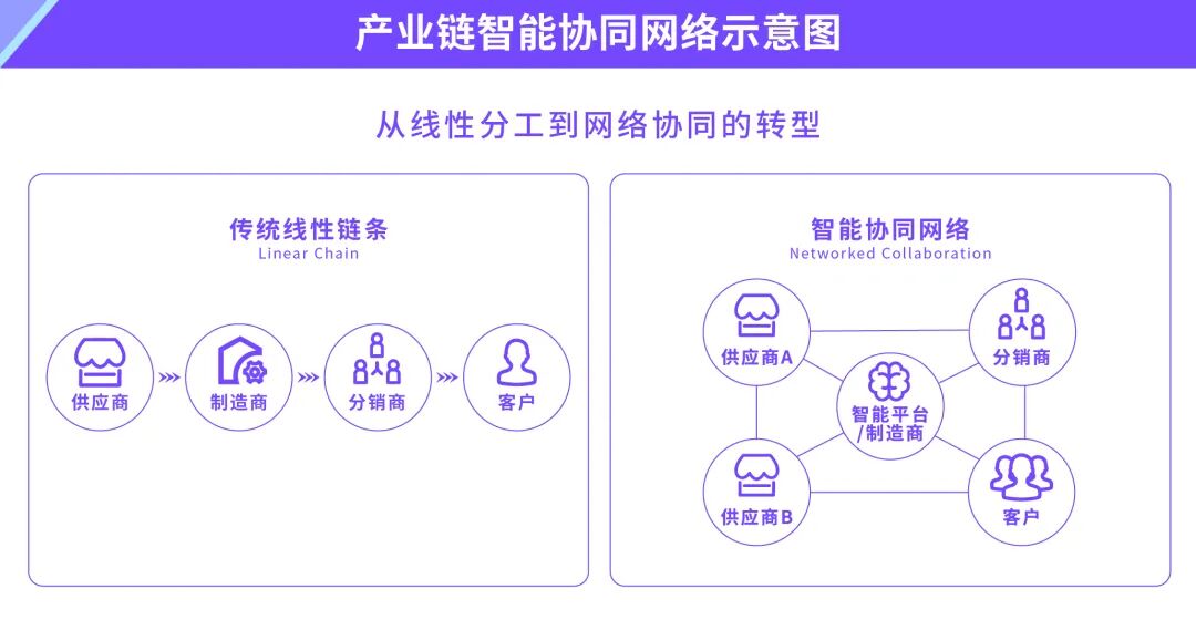 这种改变,不只是管理流程的升级、局部环节的智能化,而是对产业链组织方式、价值分配模式、企业间协同机制的根本性重构,甚至延展到供应链网络的全面重组,以及制造企业从“产品导向”到“服务导向”的商业模式创新。