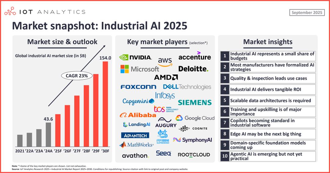 根据IoT Analytics调研报告显示,2021年,绝大多数制造企业还在将工业AI视为“实验项目”或“辅助工具”。但到了2025年,工业AI已经被写入企业路线图,成为董事会和CEO在财报季反复讨论的关键议题。