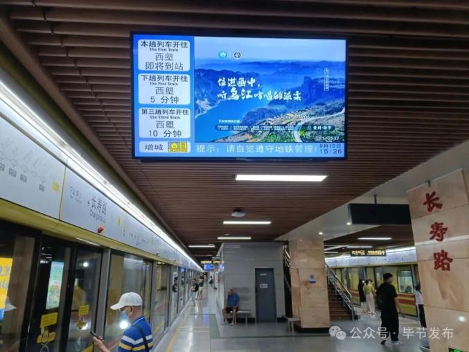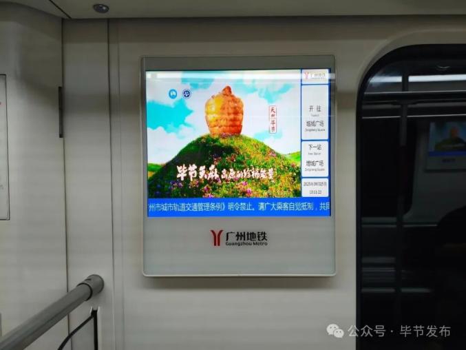 在广州地铁,站厅闸机、列车到站信息屏及车厢电视到处都滚动播放着毕节农文旅资源,宣传覆盖地铁全线3.5万台电视终端,初步估计每天有千万客流遇见毕节。