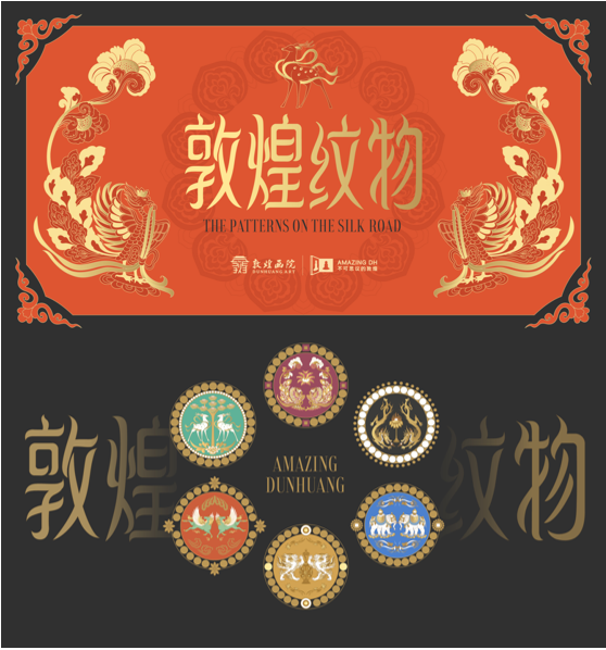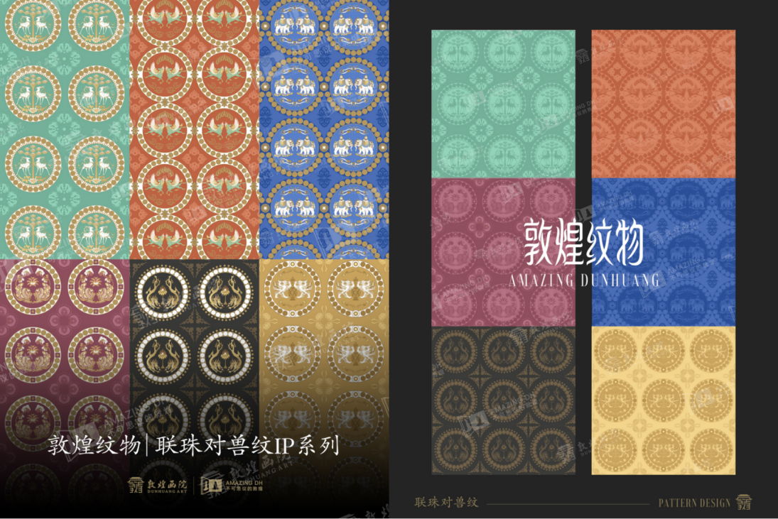 敦煌画院深入挖掘敦煌艺术宝库,从经典的联珠纹中获取灵感,将九神色鹿、六牙白象、双鸾衔绶、翼马、狮子、祥龙等传统瑞兽形象和祥瑞纹样相融合,经过十多轮修改,创新性地开发出“敦煌联珠对兽纹”系列图库。该系列文创产品保留了唐代纹样庄严恢宏的气韵,融入了现代设计语言与审美理念,为纹样赋予了新的吉祥寓意与视觉活力。