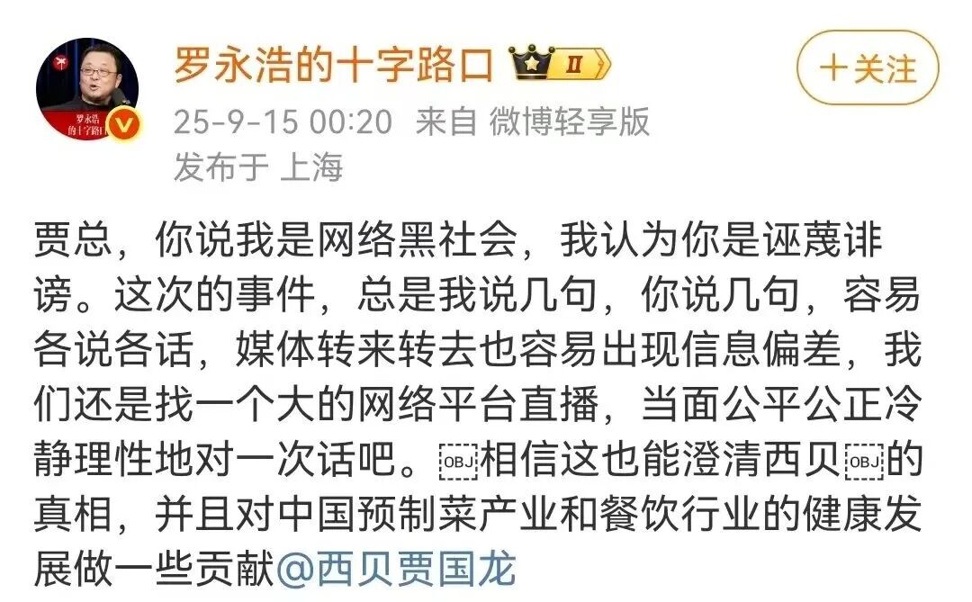 这彻底激怒了罗永浩,当晚他宣战,拒绝朋友劝架。9月15日凌晨,罗永浩希望与贾国龙进行公平公正的面对面直播对话,避免信息偏差,也给贾国龙澄清真相的机会,还能为预制菜产业和餐饮行业发展做贡献。
