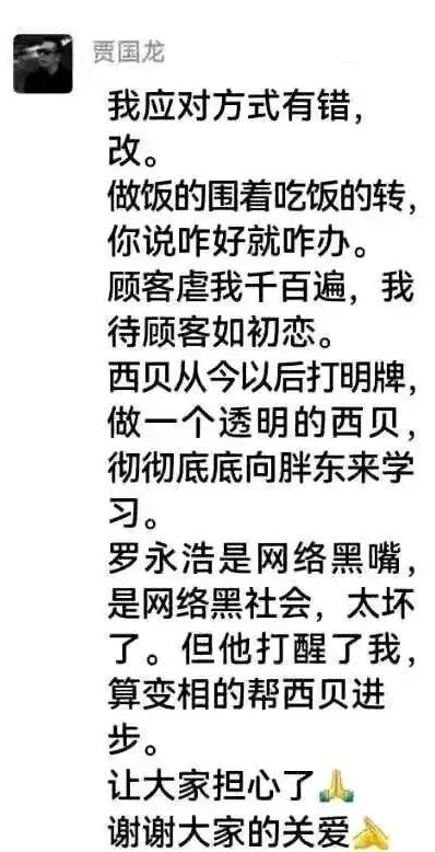 不过,“顾客虐我千百遍”这句话引起网友不满。而且这张截图并不完整,后半段贾国龙怒斥罗永浩是“网络黑嘴,网络黑社会”,但也承认罗永浩打醒了他,帮西贝进步。