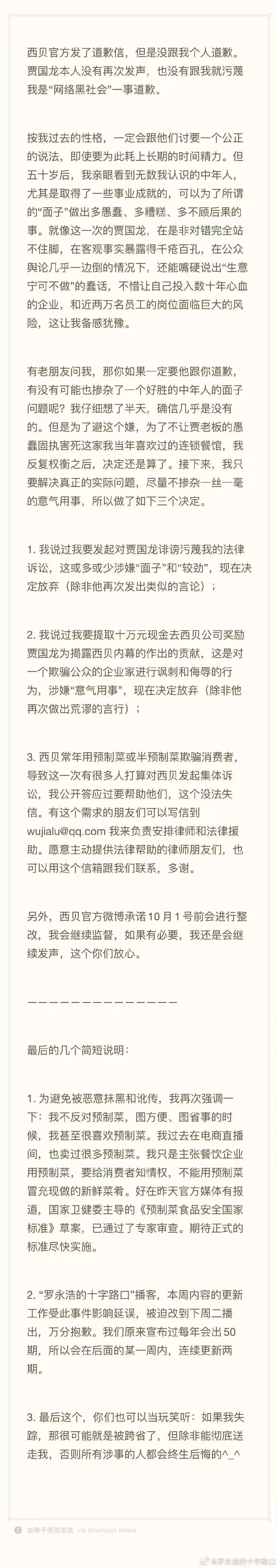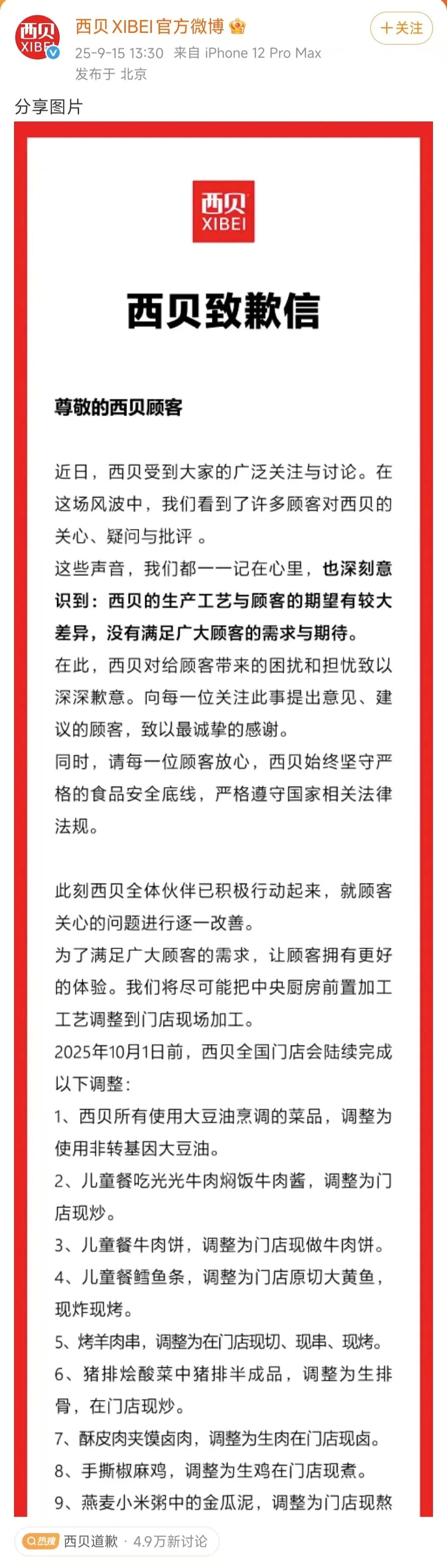 可惜罗永浩没等到贾国龙回应,却等来了西贝的正式道歉。9月15日下午,西贝官方在多平台发布致歉信,称会改善顾客关心的问题,调整中央厨房前置加工工艺到门店现场加工,全国门店10月1日前完成调整。