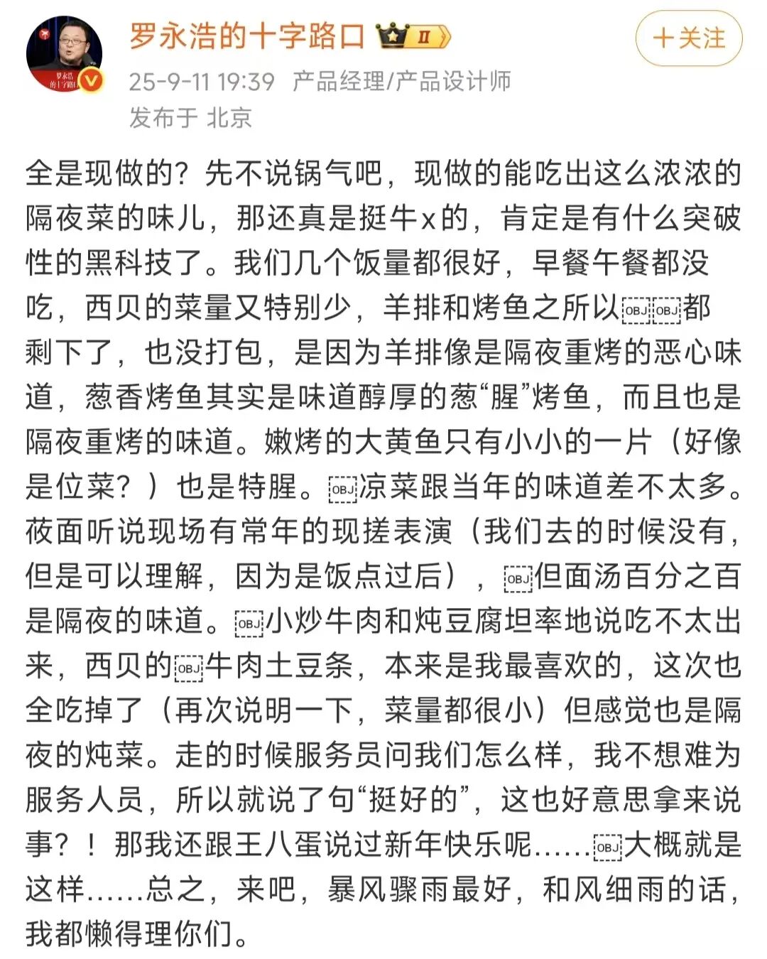 部分网友认为批评应理性克制,罗永浩的毒舌风格易引发口水战,即便主张合理,也易被质疑炒作和个人恩怨。但他打破沉默,让企业面对问题。这次他对西贝预制菜的批评,引发了“餐饮透明化”和“消费者知情权”的讨论,最后给贾国龙台阶下也赚了好感。有时候,网络需要这样的罗永浩。