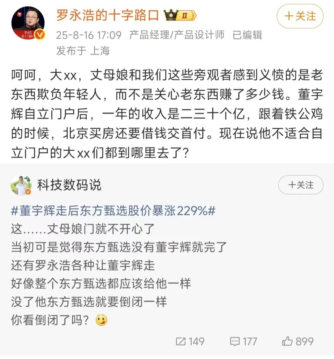 2023年12月,罗永浩卷入东方甄选小作文风波,多次炮轰俞敏洪是“铁公鸡”,指责东方甄选压榨年轻人。今年8月,他一句话引发热搜和职场压榨讨论。