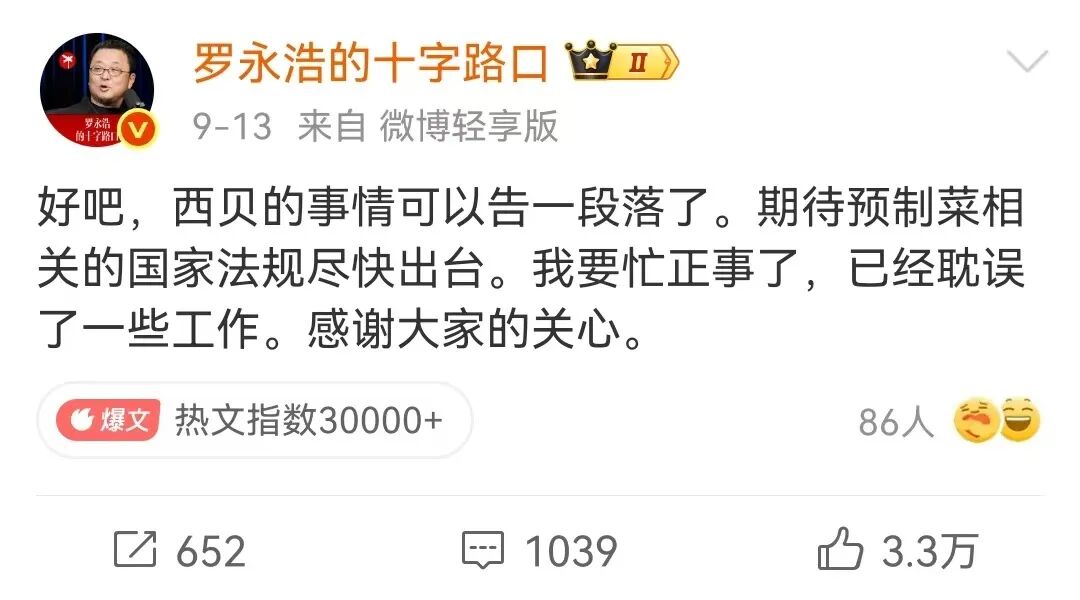 9月13日深夜,罗永浩发微博称西贝的事情可以告一段落,期待预制菜相关国家法规尽快出台。这意味着“罗永浩大战西贝贾国龙”的故事暂时尘埃落定。