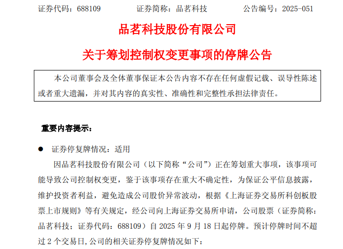 9月17日晚,品茗科技(688109)发布公告,称公司正在筹划重大事项,该事项可能导致公司控制权变更。公司股票自2025年9月18日起停牌,预计停牌时间不超过2个交易日。