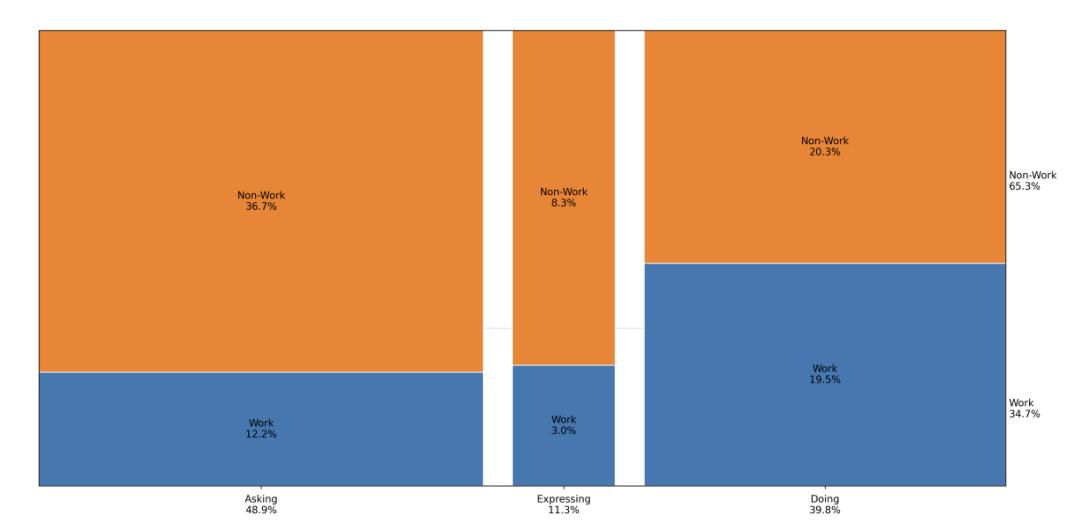 研究团队从用户意图的角度,将消息分为“询问、执行、表达”三类。结果显示, 49%的消息属于询问,40%属于执行,只有11%属于表达。