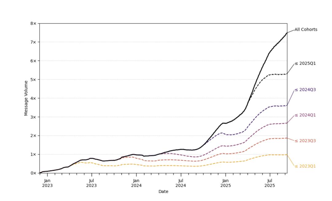 来自 ChatGPT 消费者方案(免费版、Plus、Pro)的每日消息量,按用户注册日期分组。