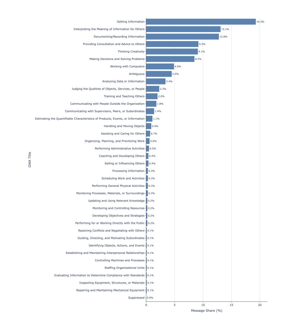报告还将ChatGPT的对话与美国劳工部的O*NET数据库进行了映射。结果表明, 近六成的工作相关消息集中在两类活动:一是获取、记录和解释信息,二是决策、咨询、解决问题和创造性思考。