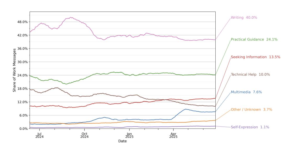 在工作场景中,写作是最主要的需求。40%的工作相关消息与写作有关,其中 三分之二是对用户提供的文本进行修改 ,而非从零开始生成新内容。这说明ChatGPT更多地是充当“润色助手”和“语言顾问”,而不是完全替代原创。