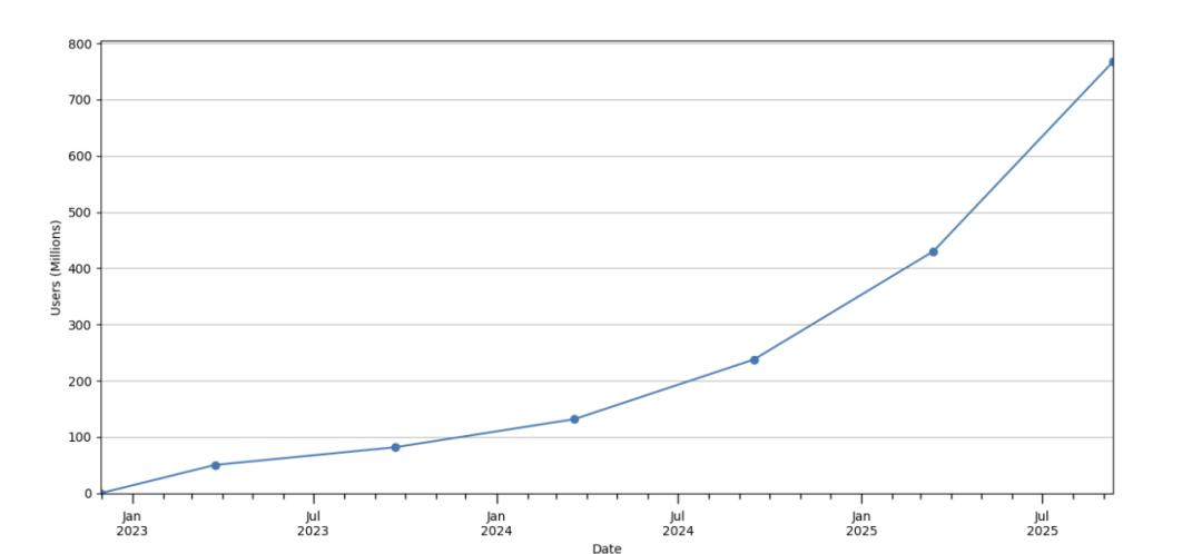 图注:消费者方案(免费版、Plus、Pro)的 ChatGPT 每周活跃用户数,以每六个月为一个时间点快照展示,涵盖 2022 年 11 月至 2025 年 9 月。