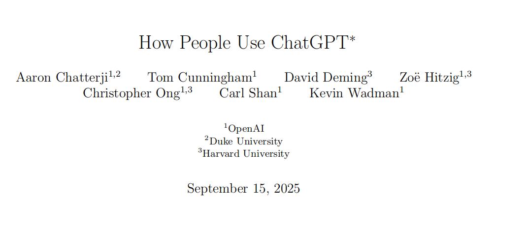 近日,OpenAI联合杜克大学、哈佛大学的研究团队,发布了一份长达63页的研究成果《人们如何使用ChatGPT》。这是首份基于内部对话数据的系统分析,揭示了ChatGPT自2022年底发布以来的真实使用情况。