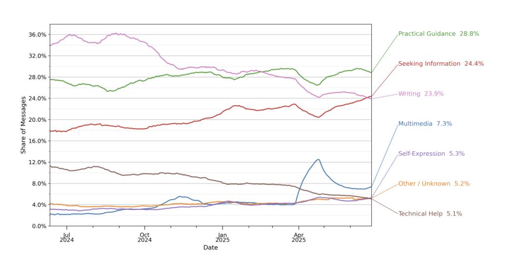 在具体主题中,实用指导、信息搜索和写作这三类最为常见,占到全部消息的近八成。例如,有人会向ChatGPT请求运动计划、食谱或教学辅导;也有人用它来生成摘要、翻译或校对文章。