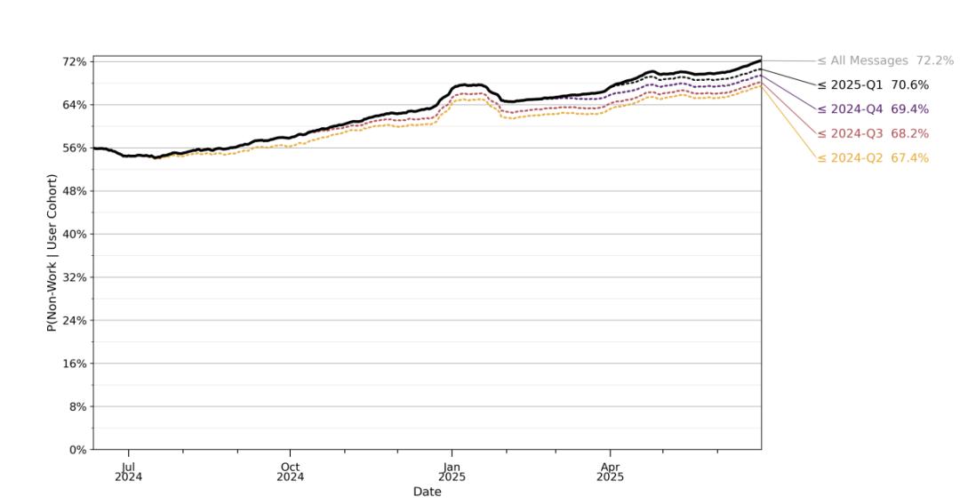 随着时间的推移,用户发送的消息中非工作相关内容的比例逐渐上升,到 2025 年中约占七成以上。