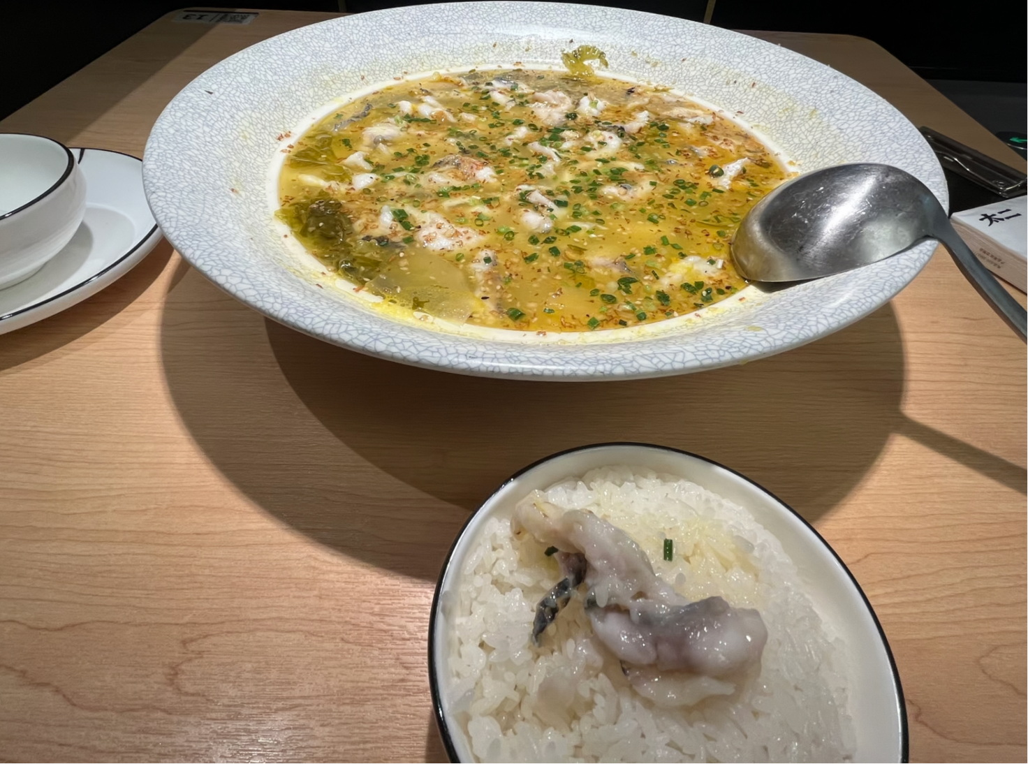 下单后,看到厨房员工把右侧处理好的鱼片倒入锅中。