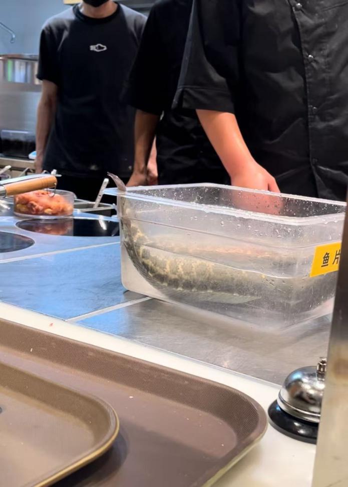 店员介绍,升级前太二采用中央工厂统一处理、当日配送鱼柳到门店的模式,升级后送活鱼到门店,门店当天杀鱼。后厨有养鱼池可查看,但《风暴眼》提出查看时,年长店员以“保障食品安全”拒绝,随后端出一条活鱼证明。