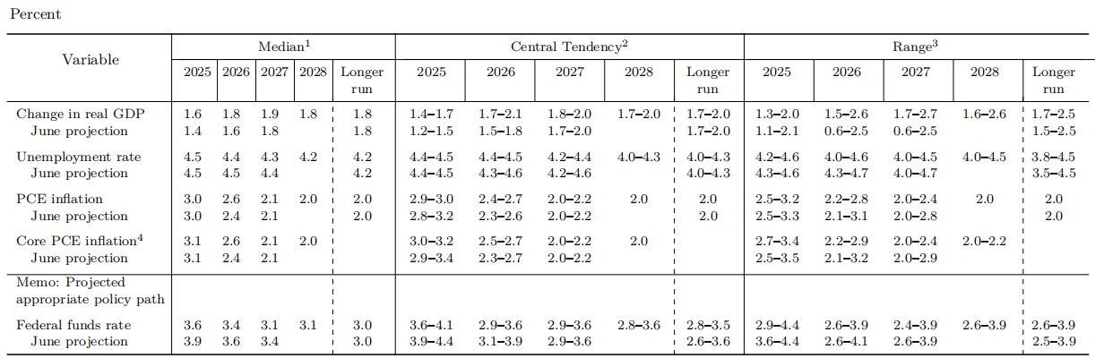失业率方面,预测今年为4.5%,与6月预测持平。通胀方面,预测今年PCE(个人消费支出)通胀为3%(6月预测值3%),2026年将回落至2.6%(6月预测值2.4%);预测今年核心PCE通胀为3.1%(6月预测值3.1%),2026年将回落至2.6%(6月预测值2.4%)。