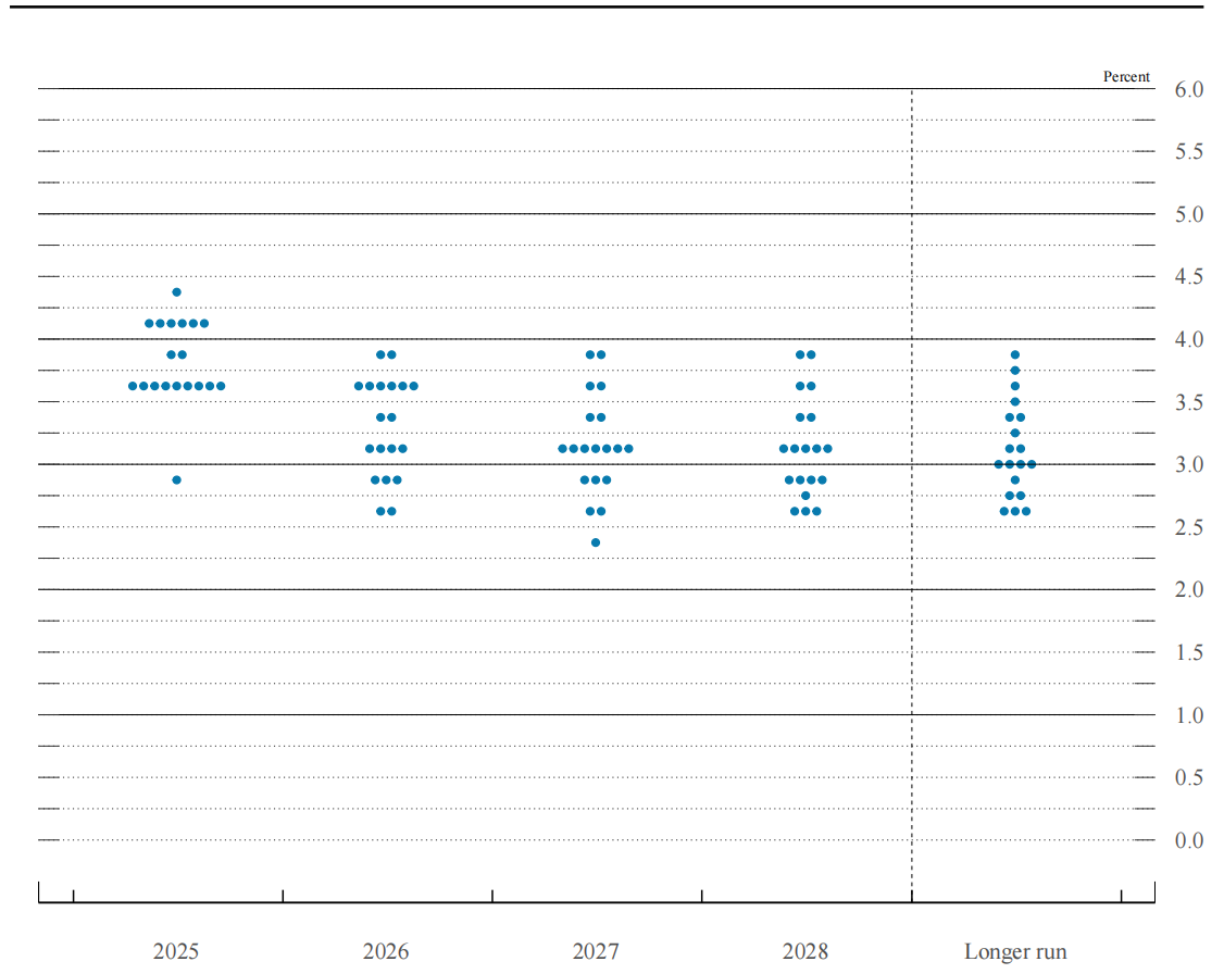 本次点阵图中,6人支持将2025年联邦基金利率的目标区间维持在当前的4% - 4.25%,9人支持年内再降息50个基点至3.5% - 3.75%,1人支持年内再降息125个基点。