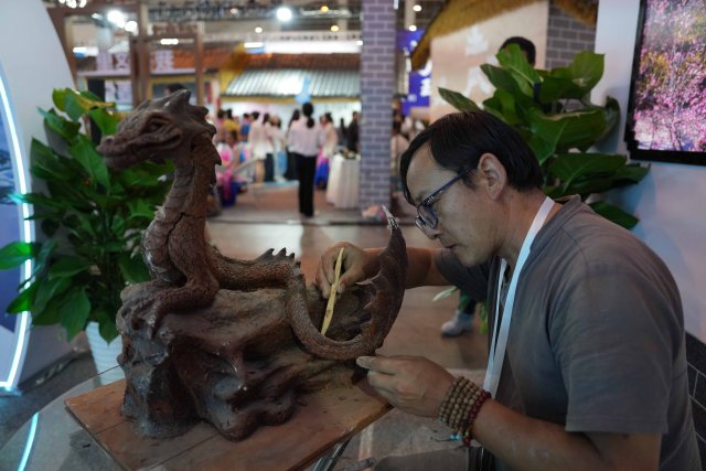 在综合馆内的大理展区,一眼就能看到等身大小的三塔小景,左边一方小小的桌子上,是宾川泥塑创作现场,指尖翻飞间,一条昂首望天的中国龙正从泥土中“苏醒”。泥塑师傅正专注于手中作品,巨龙仰头挺胸、脚踩巨石,鳞片纹路与龙须形态已初显灵动,每一处细节都透着栩栩如生。