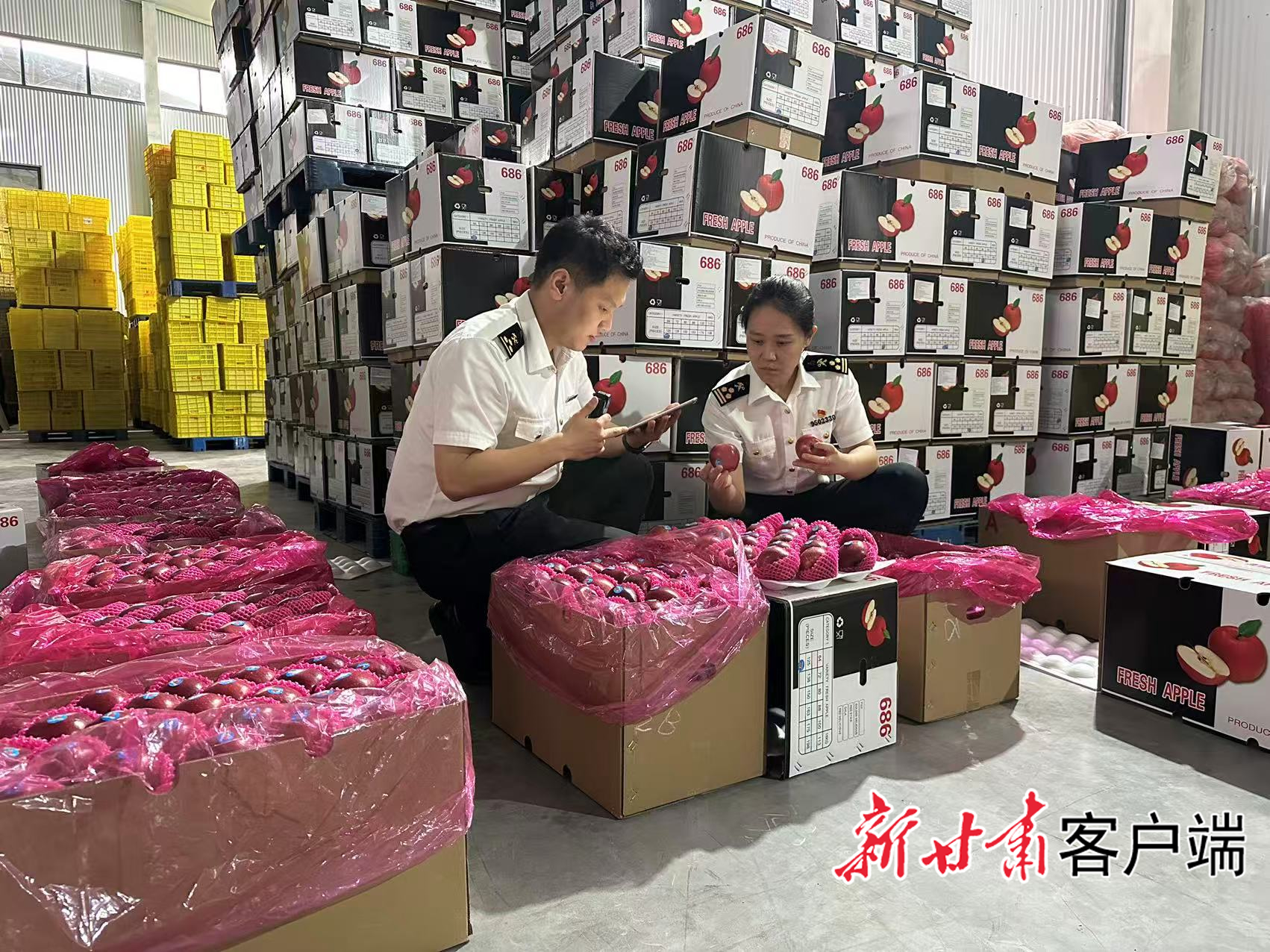 兰州海关所属天水海关关员对出境鲜苹果进行查验。滕宗敏